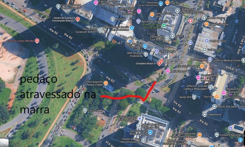 Último lembrete para pensarmos. Na saída do evento, foi difícil atravessar o cruzamento do prédio Brasil 21 para o estacionamento entre o parque da Cidade e o Ed. Parque Coporate, onde está o churrasquinho parque da Cidade. Uirá provocaria: – porque não foi de bike, Allan? Hehe, sim, ainda é difícil fazer toda a locomoção assim, mas um dia quem sabe. A questão é: não há, NÃO HÁ nem um único ponto de travessia peatonal naquele trecho, temos ali uma rotatória elíptica num cruzamento agitado e NENHUMA possibilidade de o pedestre atravessá-la, zero, exceto se ele correr.