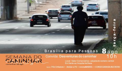 À noite, a programação voltada ao pedestre continua com debate promovido pela associação Andar a Pé – O Movimento da Gente. O bate-papo ocorrerá no Café Daniel Briand (104 Norte, Bloco A, loja 26). Na ocasião será apresentado o resultado do Safári Urbano, atividade de avaliação de calçadas de Brasília realizada em maio deste ano.