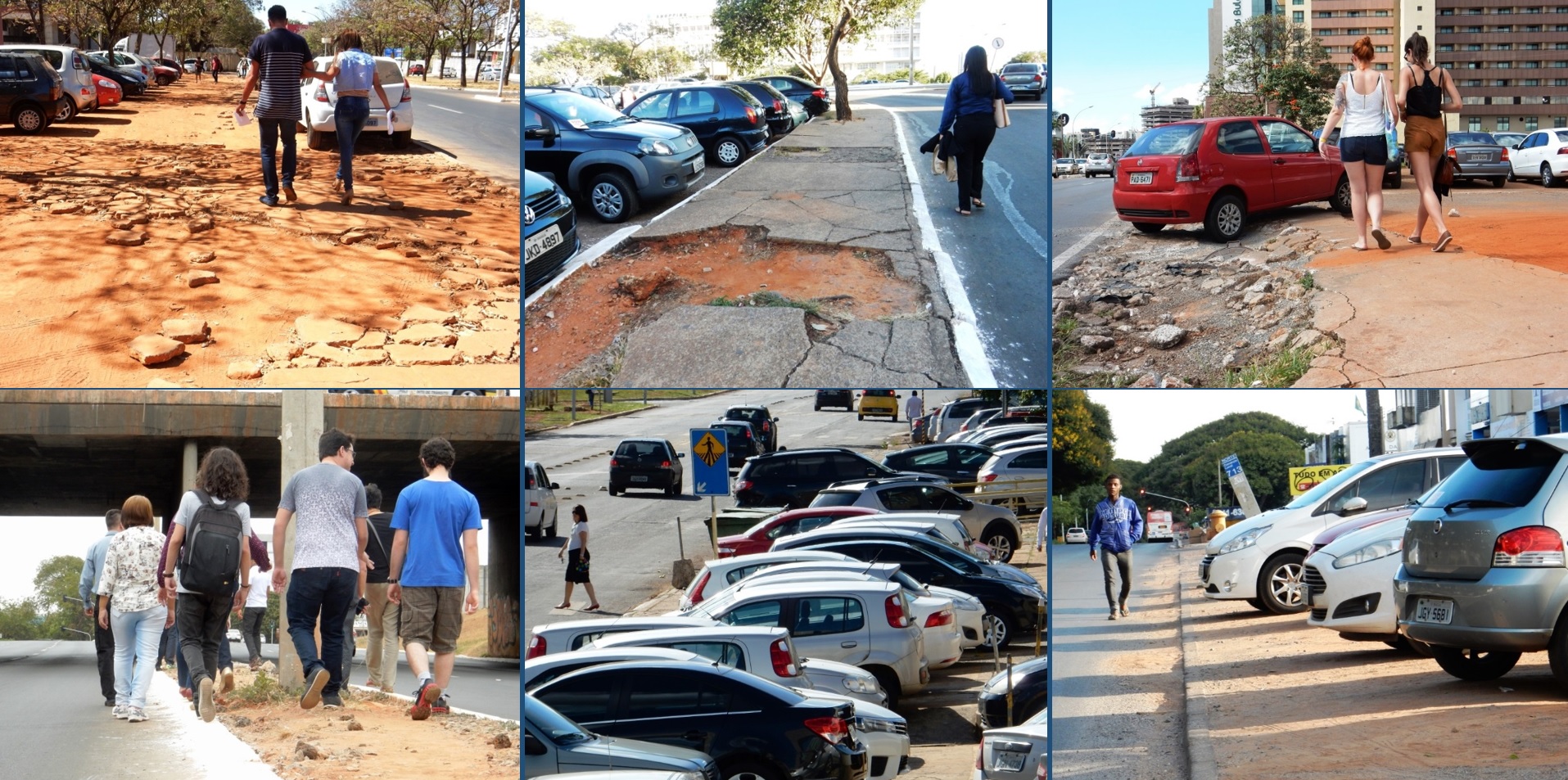 Realidade no DF: calçadas com muitas crateras e invadidas por muitos carros.