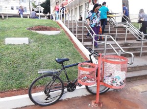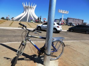 Cena comum em Brasília: bicicletas acorrentadas de forma improvisada.