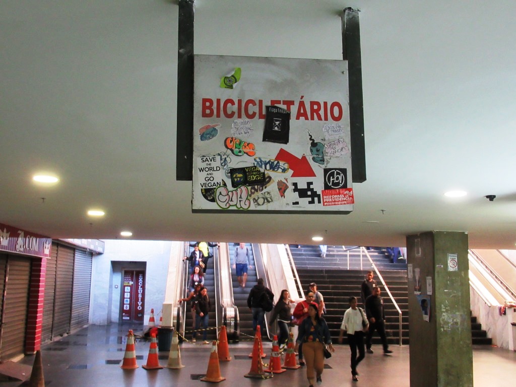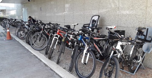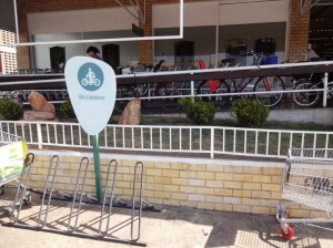 Por aqui a realidade é oposta. Nosso principal terminal de transporte nunca teve um bicicletário decente e o que era ruim ficou ainda pior. Atualmente, está bloqueado o espaço onde ficam os suportes para bicicletas na Rodoviária do Plano Piloto. Além de não ter local para estacionar, o ciclista não tem espaço seguro para passar pela rodoviária, como já relatei no texto De bicicleta na Rodoviária do Plano (clique para conferir).