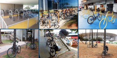 Muitas imagens de vagas para ciclistas em todo o Distrito Federal, tanto os espaços demarcados e cobertos, quanto as vagas imaginárias e improvisadas (postes, lixeiras e árvores).