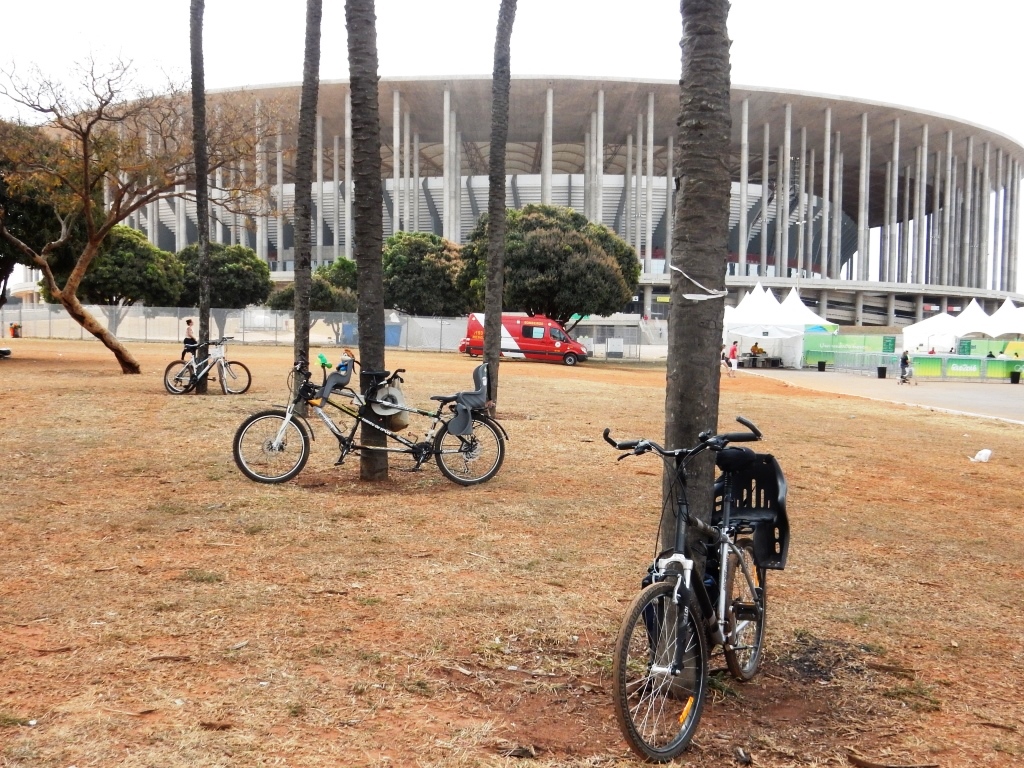 Entre os pontos que possuem vagas para ciclistas estão o Centro de Convenções e o Planetário. Mas a maioria dos locais não está preparada para receber os ciclistas. O estádio Mané Garrincha, com 72 mil lugares, simboliza bem o descaso. Em 2013, ano da inauguração da nova arena, o Governo do Distrito Federal chegou a instalar suportes numa área descoberta e longe do acesso principal. Os frágeis suportes se deterioraram ao longo dos anos e o espaço acabou sendo transformado em vagas para carros (a imagem mostra a situação do “bicicletário” do estádio entre 2013 e 2016). No ginásio Nilson Nelson e na Catedral a situação é semelhante e o jeito é arrumar alguma árvore ou poste para acorrentar a bicicleta.