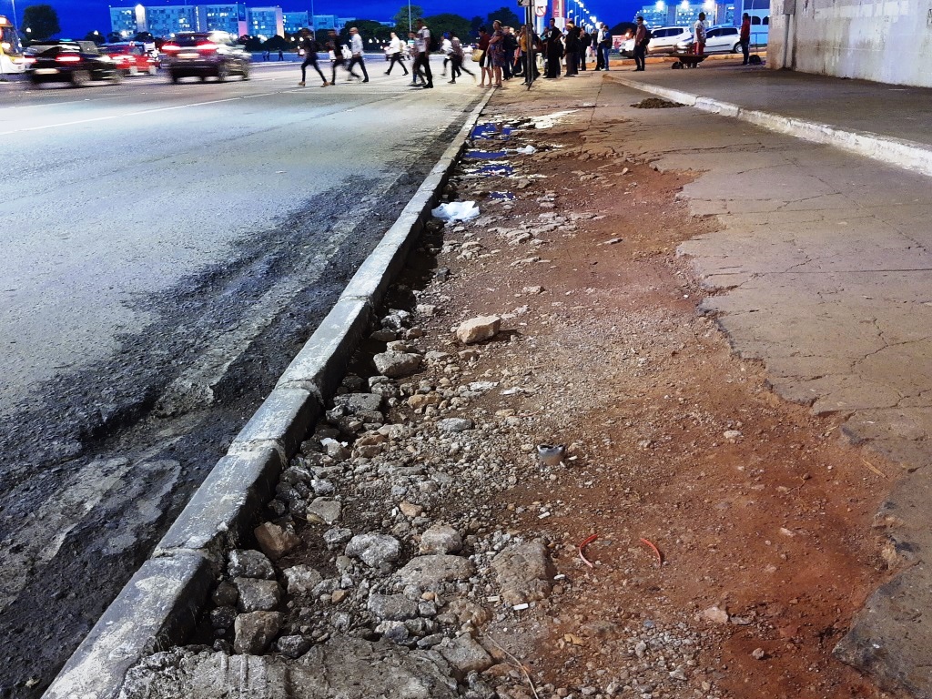 Rodoviária do Plano: calçadas destruídas e proteção contra o sol na área de embarque.