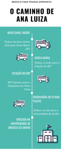 É o caso de Ana Luiza Batista da Silva, estudante da Universidade de Brasília e moradora do Novo Gama (GO). Para chegar à universidade, Ana Luiza deve pagar em dinheiro a passagem para o Gama ou Santa Maria e aí, sim, usar o Passe Livre para ir até a estação do BRT, de onde embarca em mais um ônibus para chegar à Rodoviária do Plano Piloto e embarcar em outro coletivo que se dirige até a universidade.