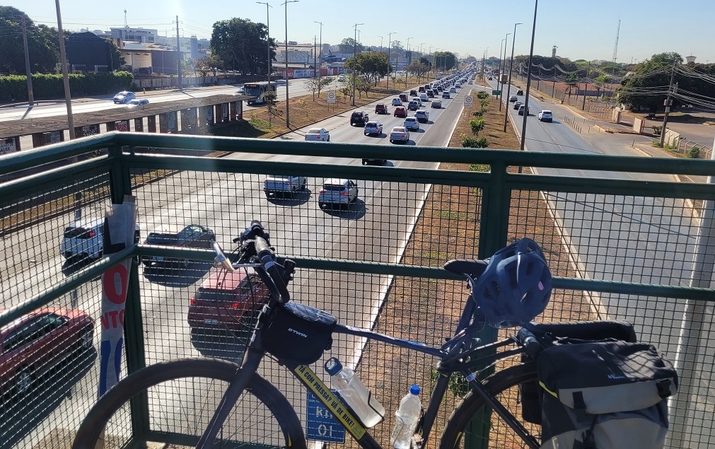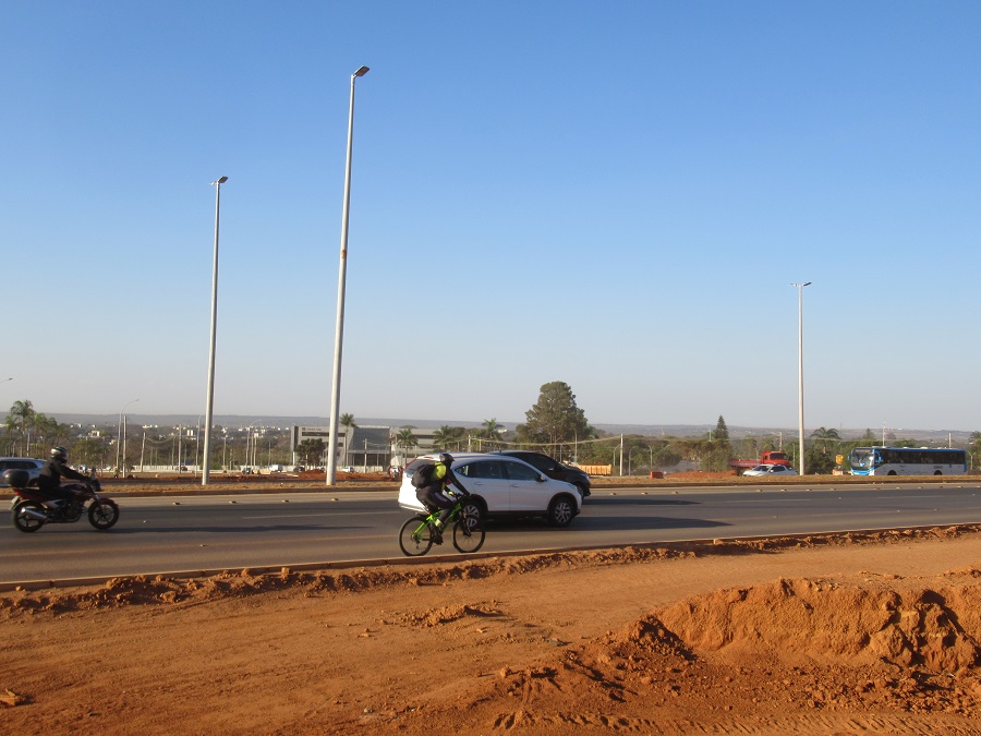 Nos 56 km de pedal constatei o caos graças à forte política rodoviarista de incentivo ao automóvel. Na altura do bairro Sudoeste, o viaduto em obras é um grande obstáculo. A região – antes agradável e arborizada – está estéril e hostil. Um carcará se hidratava numa poça lamacenta no canteiro de obras.