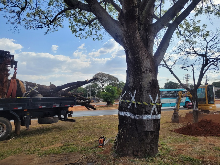 Decidi seguir pela via do Setor Policial, em obras. A placa informa tratar-se da construção de BRT (sistema rápido por ônibus). Mas ali é uma das poucas vias que tem (ou tinha) faixa exclusiva de ônibus. Será que precisava de uma grande obra? Sigo pelo asfalto tórrido, sem sombra. Mais à frente outra cena lamentável: várias árvores frondosas marcadas com ‘X’. Possivelmente o canteiro arborizado vai virar pista e intensificar a ilha de calor.