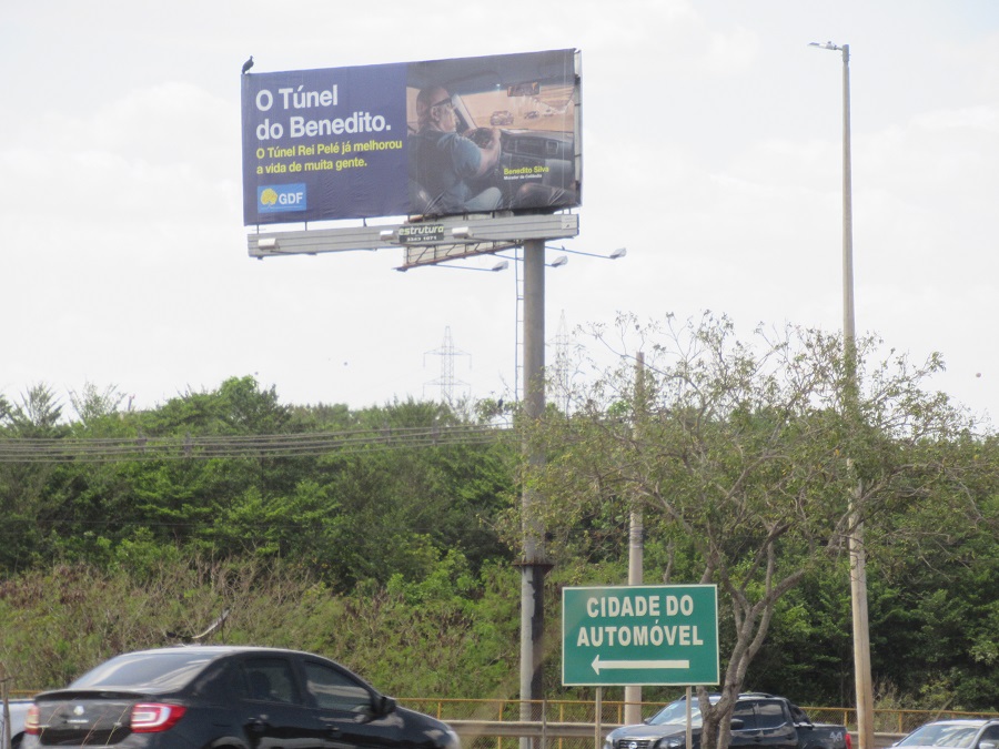 Fiz uma pausa para hidratar e segui de volta pela EPTG. Novo perrengue para alcançar a ciclovia, que continuava vazia. De repente me deparo com essa cena emblemática: placa indicando a Cidade do Automóvel e ao fundo o anúncio do GDF enaltecendo o Túnel de Taguatinga.