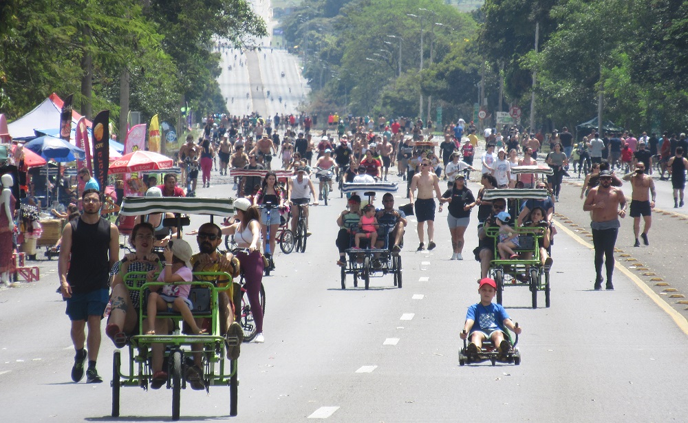É curioso que aos domingos a situação no Eixão muda drasticamente. Os carros vão embora e uma multidão se reúne, caminha e pedala em segurança. Têm piquenique, música e festas de aniversário nos canteiros gramados ao longo do Eixão.