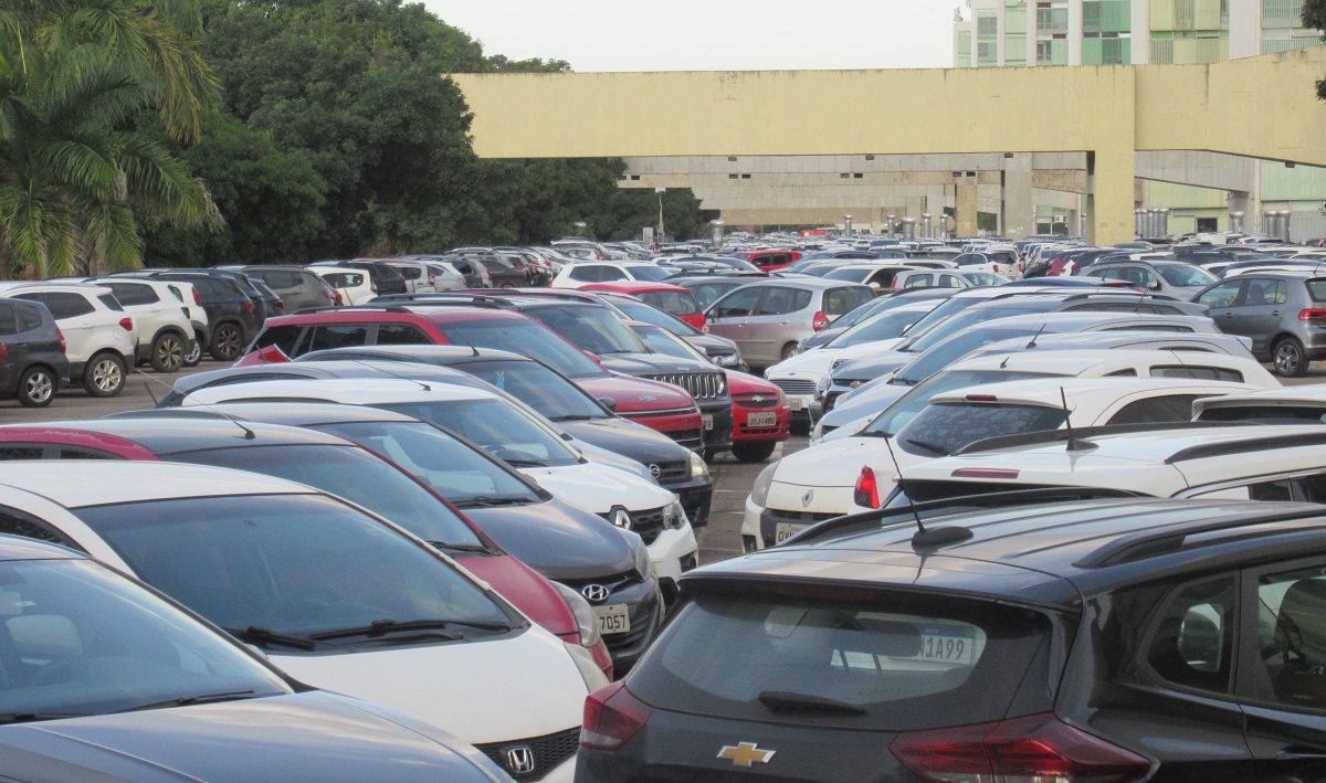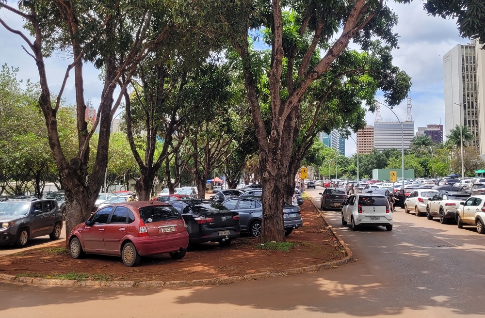 Estacionamento cheio na Esplanada dos Ministérios e canteiro invadido por carros.