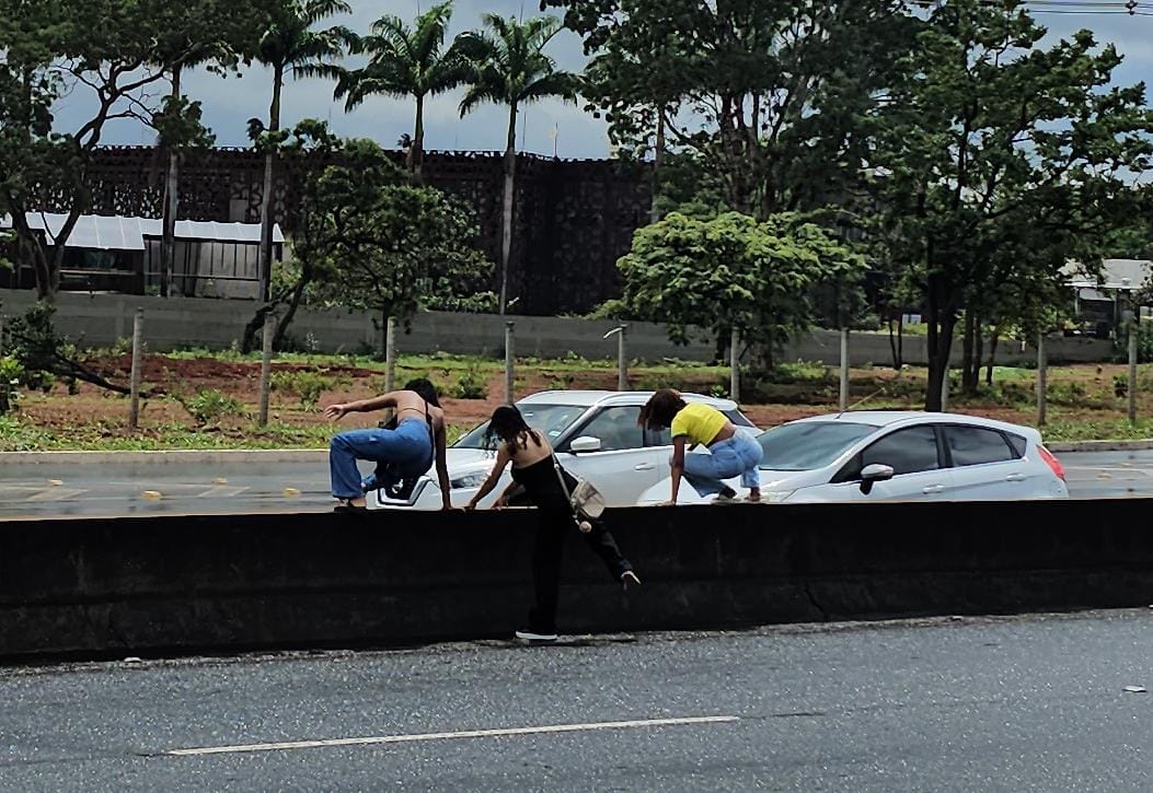 Pedestres pulam mureta na travessia próximo à ponte JK. Foto: Uirá Lourenço.