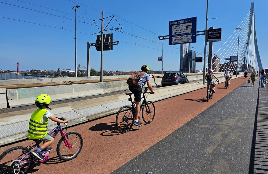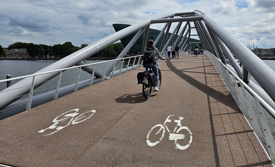 Para exemplificar a boa e justa distribuição do espaço viário, a avenida que leva à estação central de trem de Amsterdã tem calçadas largas e ciclovias em ambos os sentidos, o tram (bonde elétrico) passa na parte central. A circulação de carros se restringe a uma faixa em apenas um sentido.