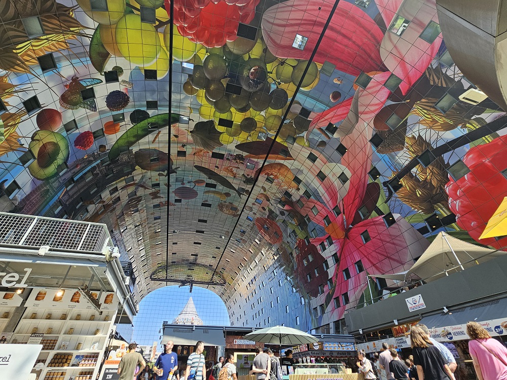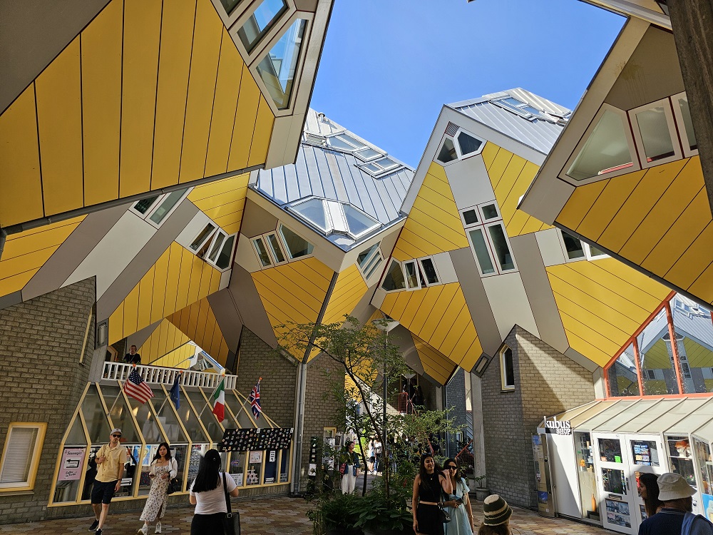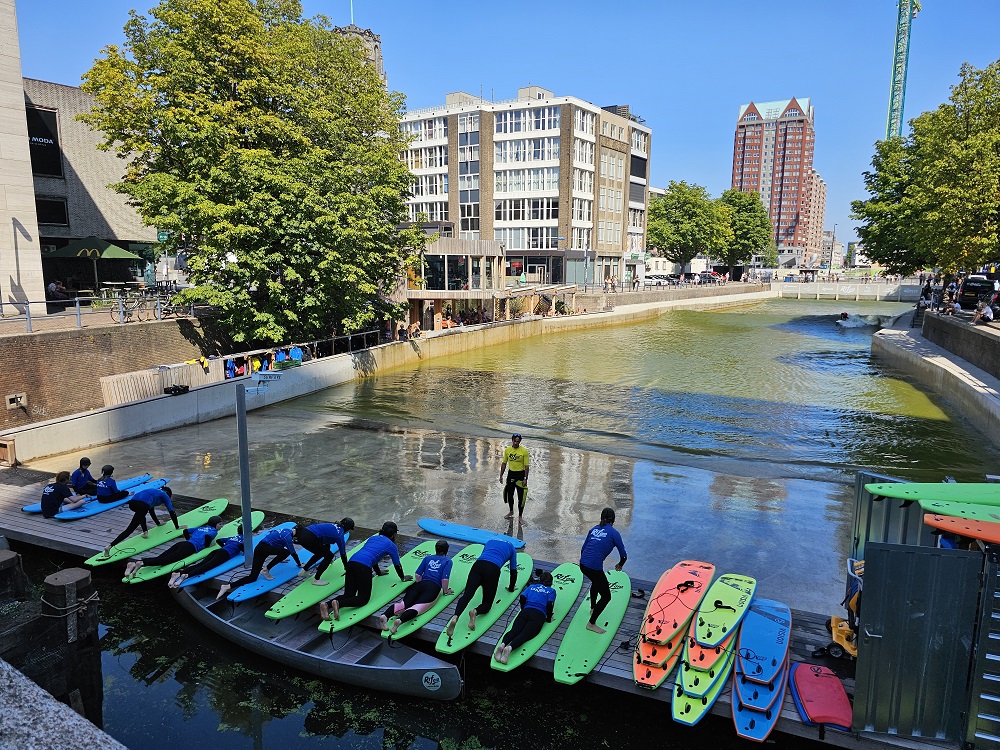 Entre as atrações, o mercado (prédio moderno com muitas bancas de quitutes), as casas-cubo amarelas e a ponte Erasmus (estaiada, com movimento intenso de pedestres e ciclistas). Ao caminhar, notei algo bem curioso: em um dos canais se praticava surfe urbano, com aulas para iniciantes. Um mecanismo é acionado para formar as ondas (de bom tamanho).