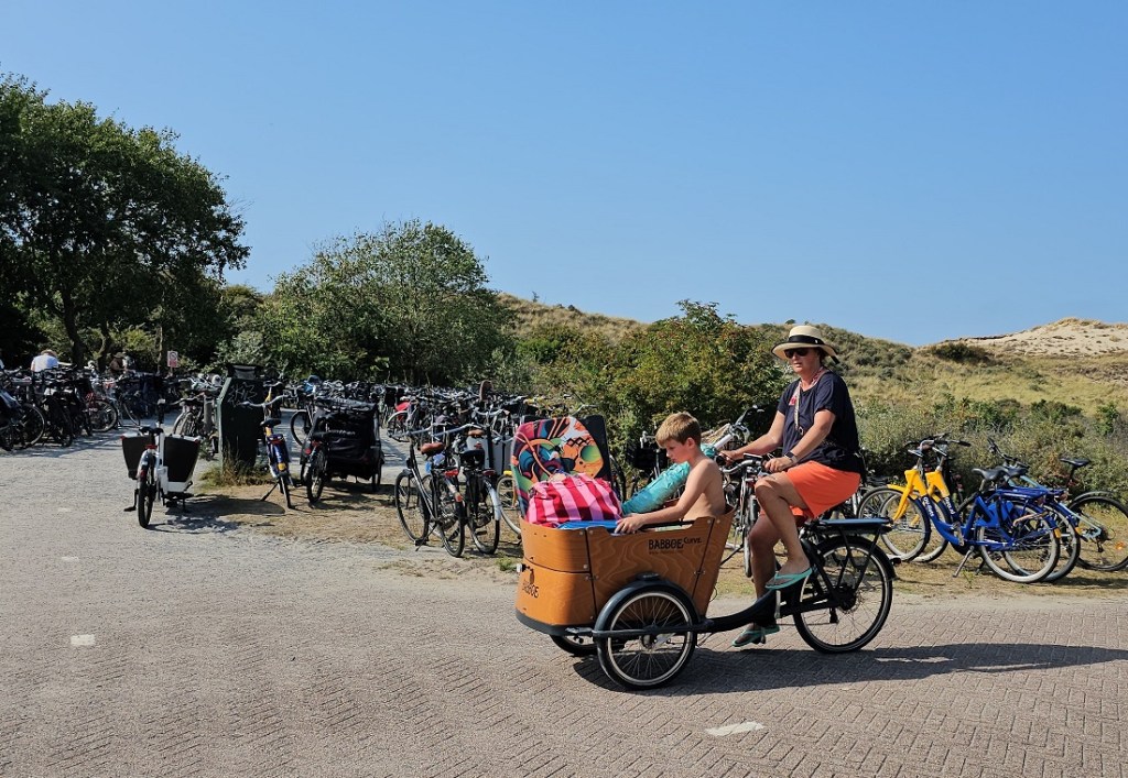 Como era de se esperar, os holandeses também vão à praia de bicicleta. Vi bicicletas e triciclos com crianças, guarda-sóis e pranchas. Os locais de acesso à praia com muitas bicicletas estacionadas. Uma ciclovia lisinha, de grande extensão, margeia a praia: o mar de um lado, a bela vegetação do outro, com pontos de parada para apreciar a paisagem.