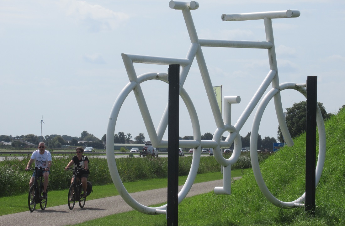 Na quarta etapa da jornada, entre as cidades de Giethoorn e Utrecht, me deparo com uma bicicleta branca bem grande na beira da estrada. A imagem me remeteu às ‘ghosts bikes’ comuns no Brasil, que simbolizam a morte de ciclistas atropelados por motoristas. Mas, num país tão seguro e desenvolvido, logo me dei conta que se tratava de um monumento para enaltecer a bicicleta, que está tão presente e simboliza o país. Aliás, logo ao desembarcar no aeroporto de Amsterdã, um grande anúncio ressalta a bike.
