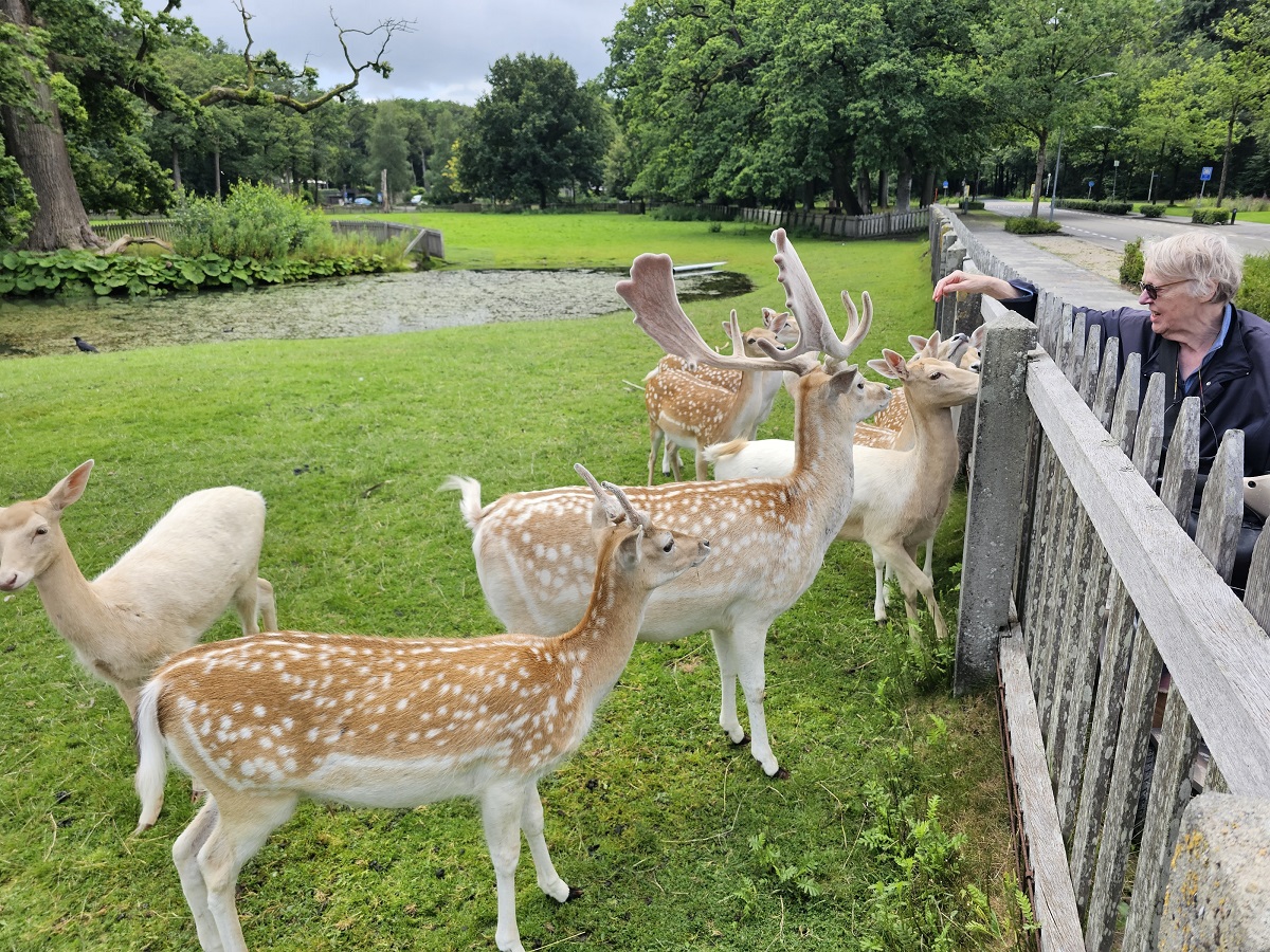 Adorei passar por bosques, áreas com grandes árvores. Em todos os sete trechos da jornada passei por jardins e bosques. As árvores (sombra) costumavam estar presentes nos caminhos ao longo das rodovias (com ciclovia nas laterais). Uma cena singela: num jardim de uma pequena cidade que abriga grupo de veados, a senhora num triciclo passeia e alimenta os animais. A mãe e os filhos também passeiam calmamente, admiram a família de cervídeos.