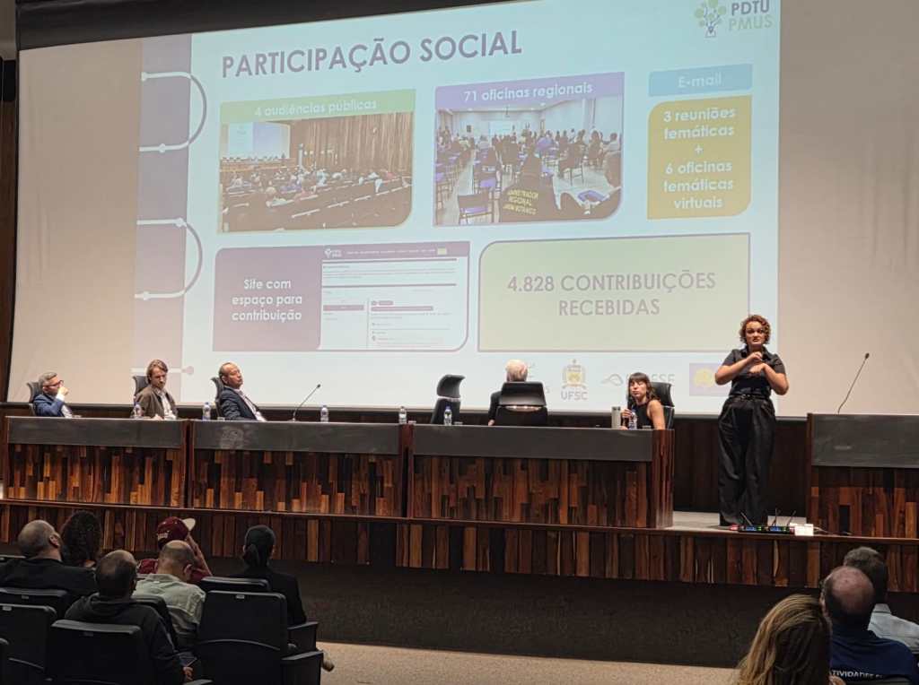 Destacou-se a participação popular, com 4.828 contribuições recebidas, e se falou de novas propostas: anel viário de cargas e inclusão de dois novos cenários aos cinco previamente apresentados. O cenário 6 com custo baixo e facilidade de implantação, com faixas exclusivas; o cenário 7, com mais investimentos no transporte por trilhos, VLT e metrô (criação da linha 2). Em seguida se falou da minuta do projeto de lei, que ficou disponível para consulta em portal específico na internet.