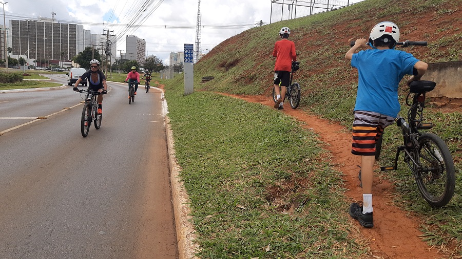 E o que dizer das condições para caminhar e pedalar? O Distrito Federal ainda tem muitos locais sem calçada, mesmo na área central de Brasília. Os caminhos de rato (linhas de desejo) nos gramados destacam o percurso de pedestres e ciclistas. A falta de rampas é a regra, em vez de exceção. E temos um problema crônico de falta de manutenção e iluminação nas calçadas e ciclovias.