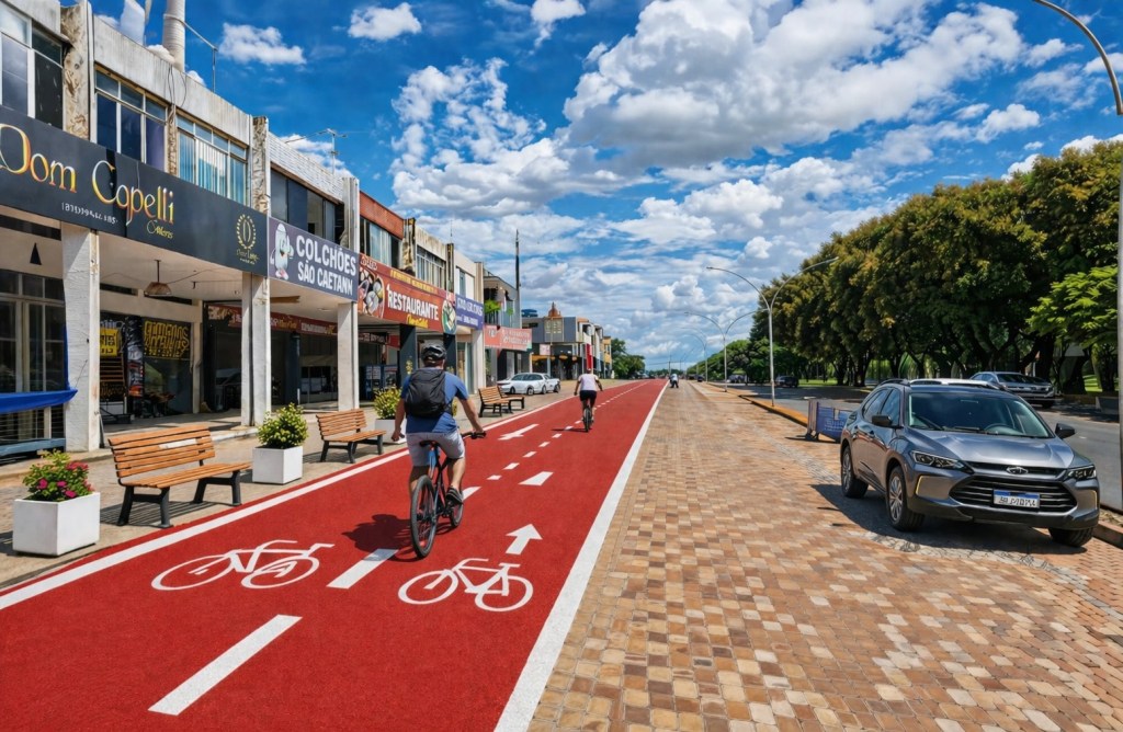 Eixinho com calçada compartilhada para pedestres e ciclistas (ChatGPT).