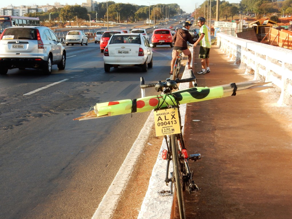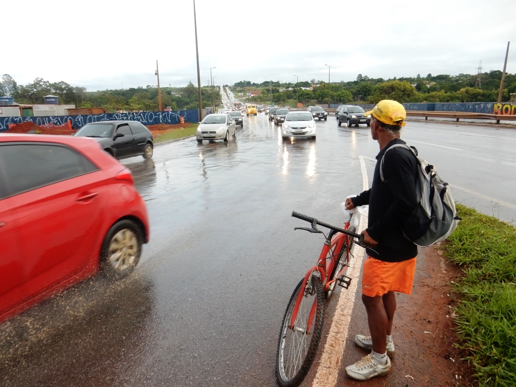 Presenciei alguns ciclistas e pude acompanhar um fazendo a travessia da ponte do Bragueto. Ele faz todo dia o trajeto do Varjão ao HUB e, como era de se esperar, relatou que o trecho da ponte é terrível, onde ele passa um longo tempo só para atravessar a via de acesso à ponte. A calçada no lado leste da ponte – utilizada por pedestres e ciclistas – é estreita, está deteriorada, não possui continuidade e tampouco há ponto de travessia para acessar o outro lado da ponte.