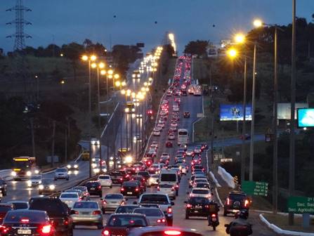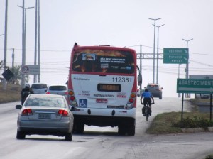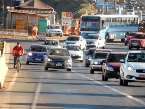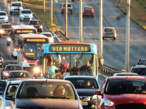 A desproporção entre carros e ônibus é bem evidente na ponte do Bragueto. A maioria dos carros está ocupada apenas pelo motorista. Superlotação nos ônibus e ausência de faixa exclusiva ao transporte coletivo.