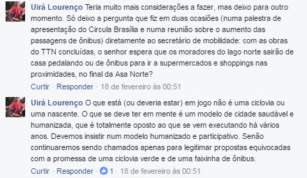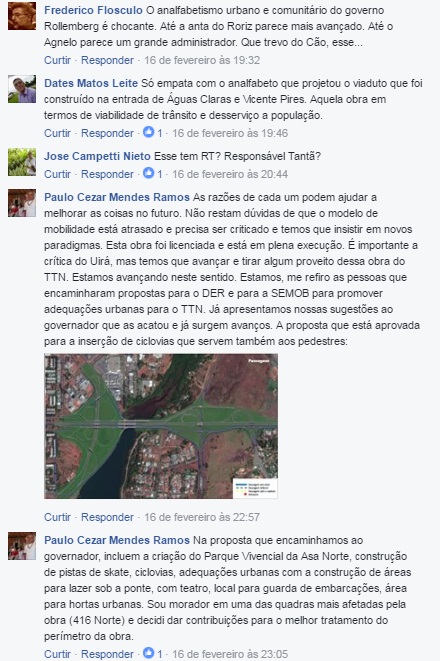 – Comentários publicados com questões sobre os projetos no norte do DF, na publicação da Secretaria de Mobilidade no facebook: