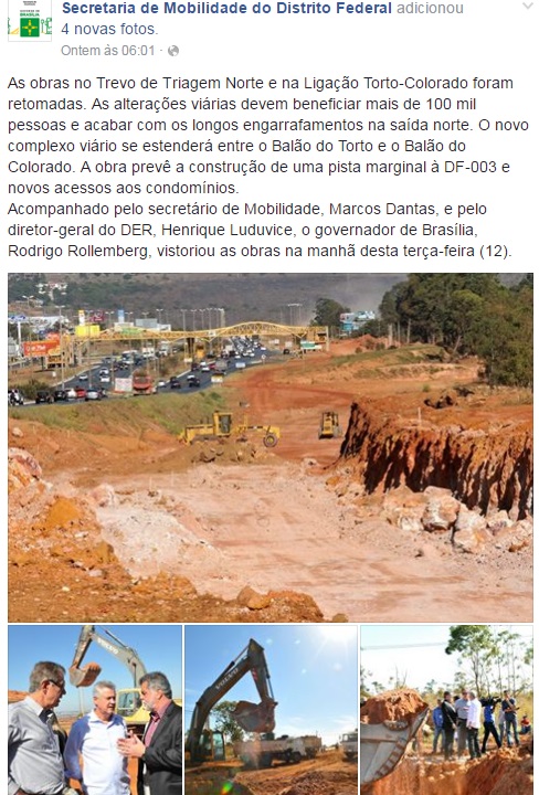 – Secretaria de Mobilidade anuncia no facebook retomada das obras rodoviaristas e destaca supostos benefícios à qualidade de vida (12/7/2016):