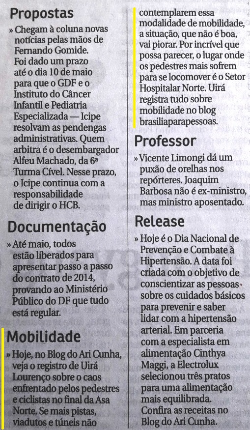 Informe publicado no Correio Braziliense (22/6/2014). Em destaque, alguns trechos que revelam o viés rodoviarista do projeto, com foco na ampliação do espaço aos carros e na fluidez motorizada. [Clique na imagem para ampliar]