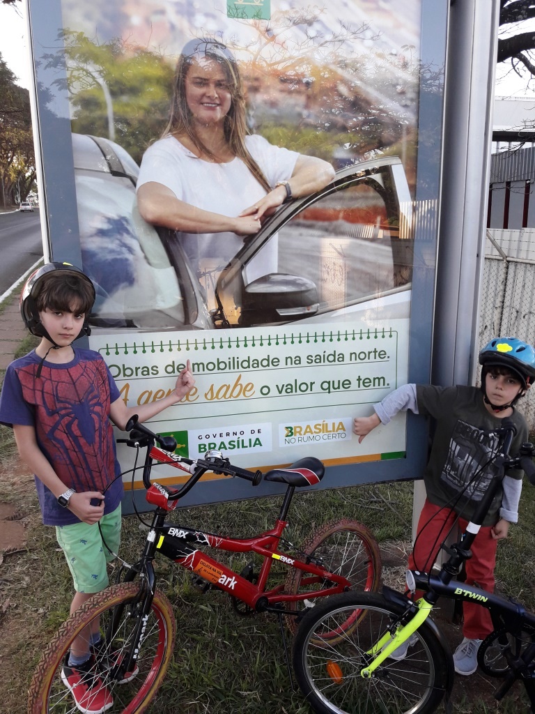 Em um dos anúncios da W3 Norte, crianças atualizam a frase: Obras de Imobilidade.