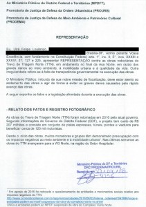 – REPRESENTAÇÃO protocolada em 27/4/2018 nas Promotorias de Urbanismo (Prourb) e de Meio Ambiente (Prodema) do MPDFT, em razão das irregularidades nas obras (meio ambiente, mobilidade urbana e falta de transparência):