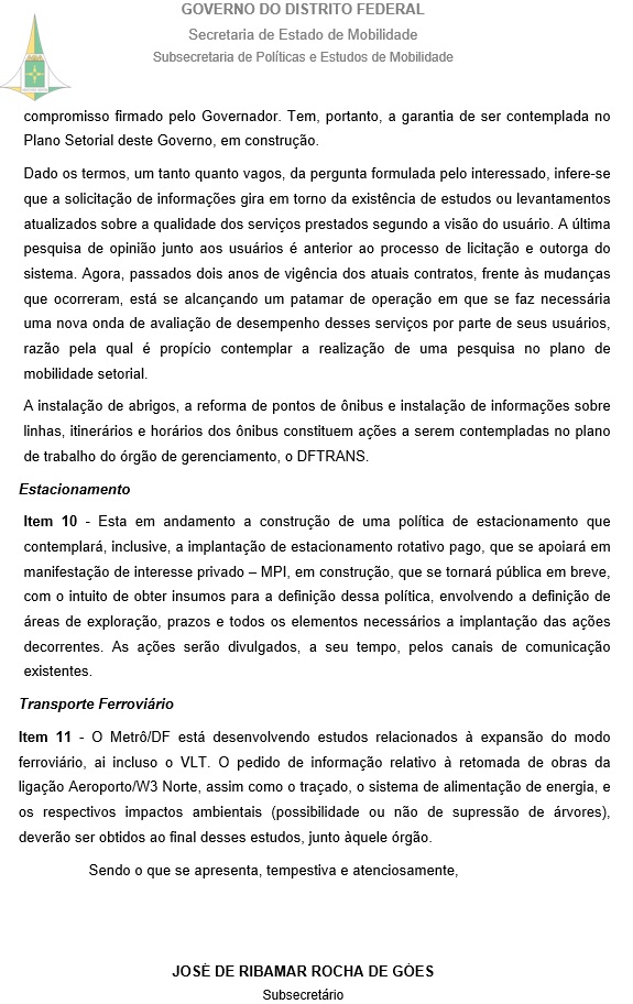 Resposta da Secretaria de Mobilidade do DF (8/9/2015):