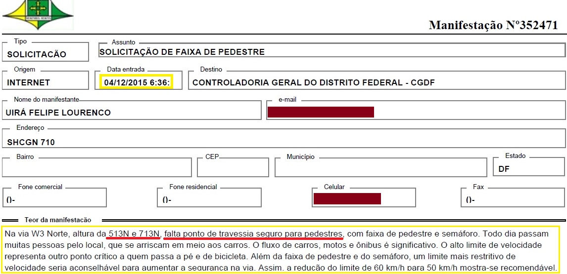 No final de 2015, ao constatar a grave insegurança para atravessar a via W3 Norte (513/713N), fiz solicitação ao Detran-DF de faixa de travessia e semáforo.