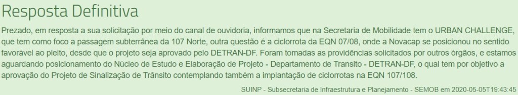 – Solicitação de Ciclofaixas em Brasília – via S2, via de acesso à Câmara Legislativa e Setor Médico-Hospitalar (14/7/2020):