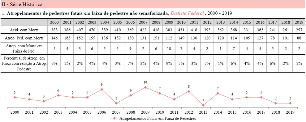 Prezado Cidadão, Encaminho a Vossa Senhoria o informativo fatal de acidentes ocorridos em faixa de pedestres do ano de 2019. Ressalto que os dados são preliminares até a publicação do anuário estatístico de acidentes de trânsito de 2019. Atenciosamente, Ouvidoria DETRAN-DF