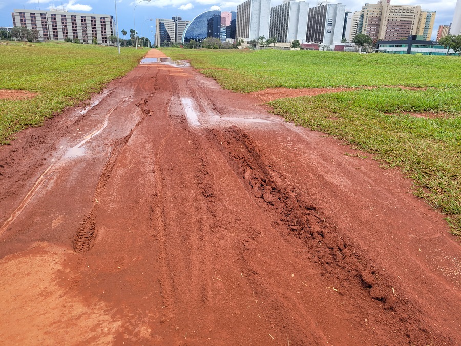 Nesse período de chuvas a situação piora e o trecho da ciclovia fica intransitável em razão do acúmulo de lama.