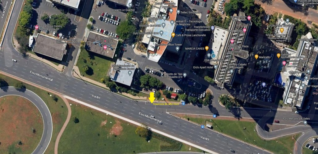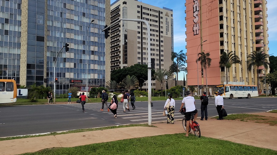Ao passar pelo Setor Hoteleiro Norte percebo que as condições para os pedestres precisam melhorar. Um dos problemas é a insegurança na travessia. A falta de locais com faixa de travessia e o excesso de velocidade dos motoristas deixam pedestres e ciclistas em grande risco.