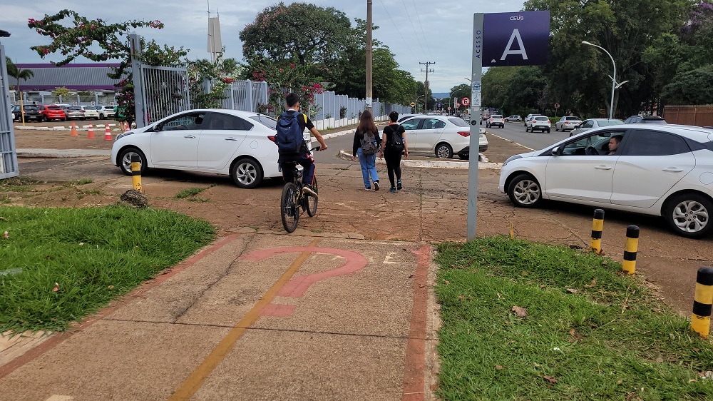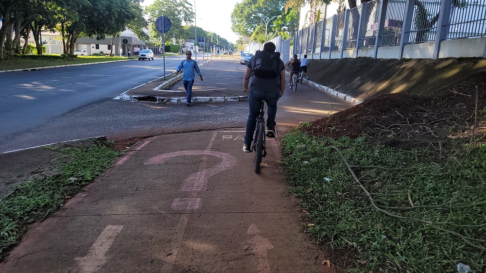 Quem passa de bicicleta precisa passar entre os carros em volta do CEUB, pois a ciclovia acaba de repente. Há inclusive interrogações – pintadas há alguns anos nos fragmentos de ciclovia – que questionam a falta de continuidade no caminho dos ciclistas.