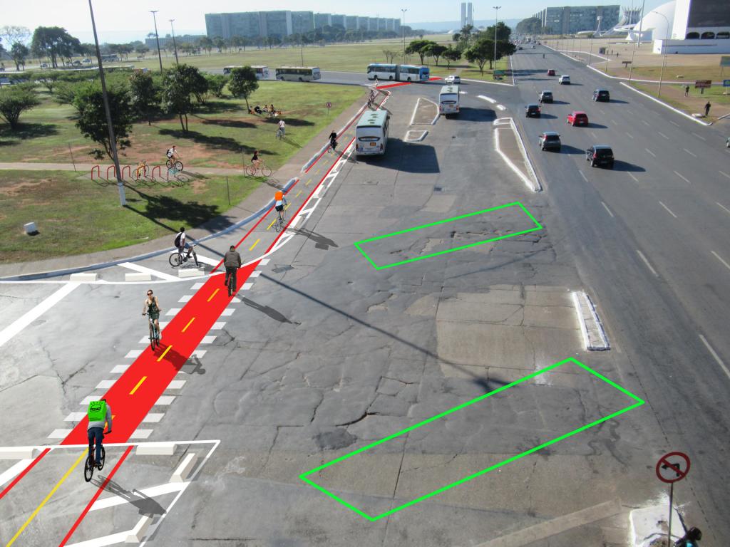 Pode-se corrigir esse problema de forma relativamente simples e barata, com a delimitação de ciclofaixa no espaço viário (com seis faixas para o fluxo motorizado). A faixa da esquerda em cada sentido da Esplanada poderia ser reservada para a circulação dos ciclistas, devidamente sinalizada e segregada do espaço utilizado pelos automóveis.