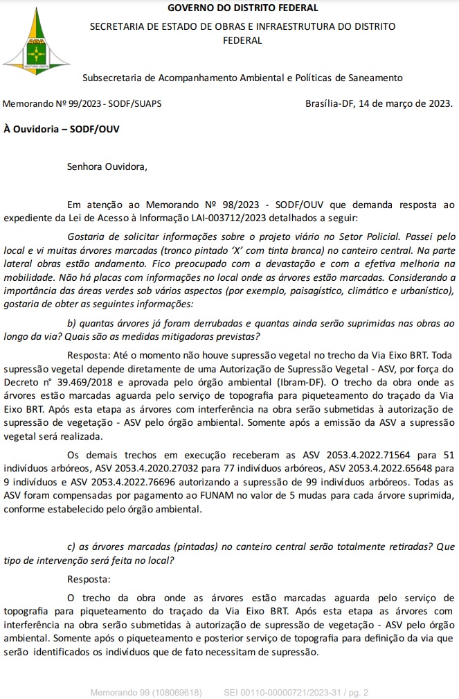 g) de que forma o Governo do Distrito Federal informa a população a respeito do andamento das obras? Não seria necessário reforçar a sinalização no local, com placas e informes sobre a proposta em si, sobre a grande retirada de vegetação e sobre os impactos ambientais?