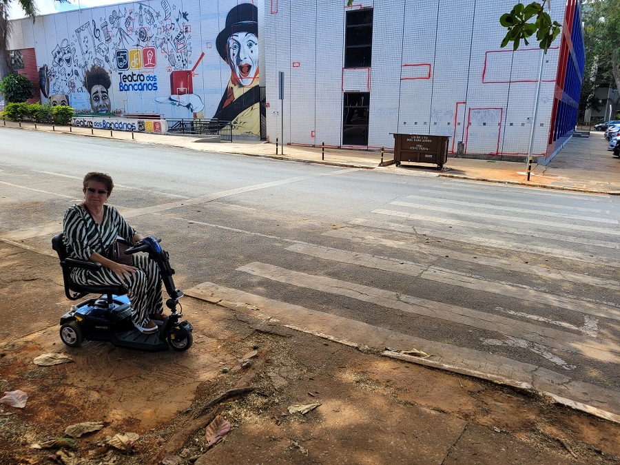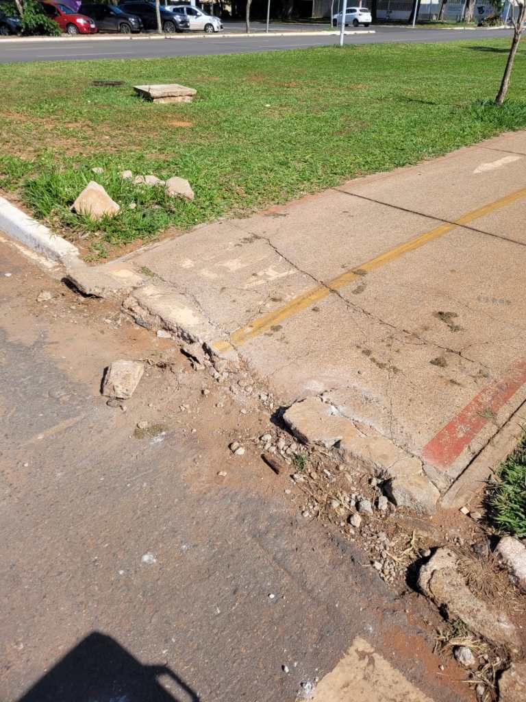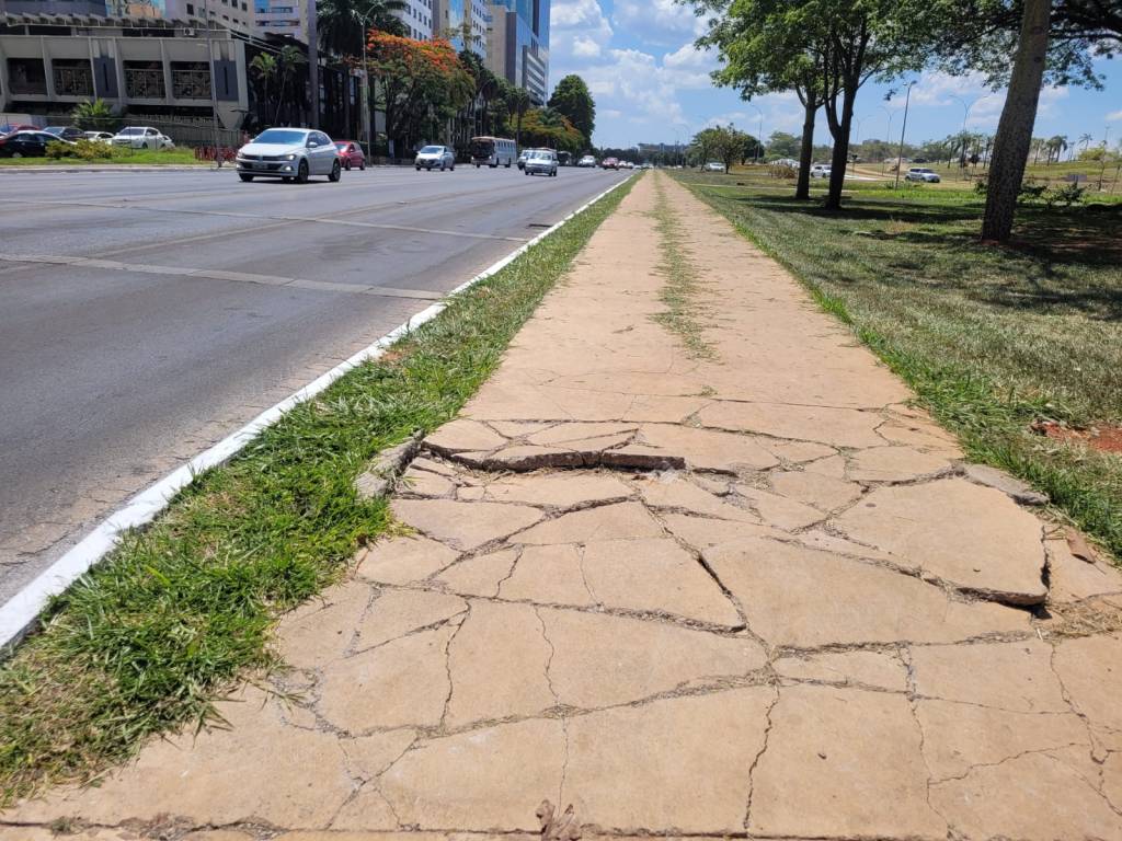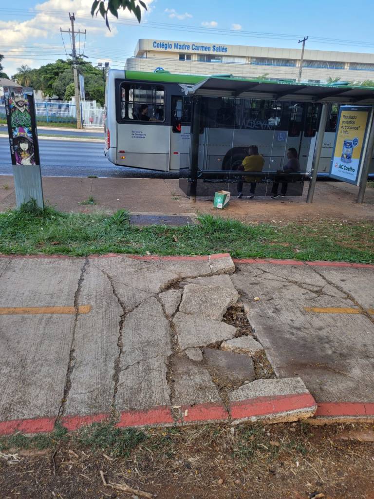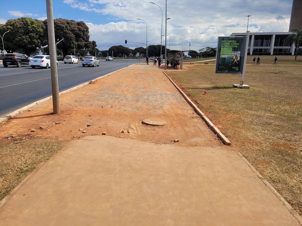 No Eixo Monumental, próximo ao Ministério Público (MPDFT), a calçada está bem deteriorada. Uma pessoa com deficiência que desembarque do ônibus fica impossibilitada de andar no local e acessar o Ministério Público em razão das crateras no caminho.