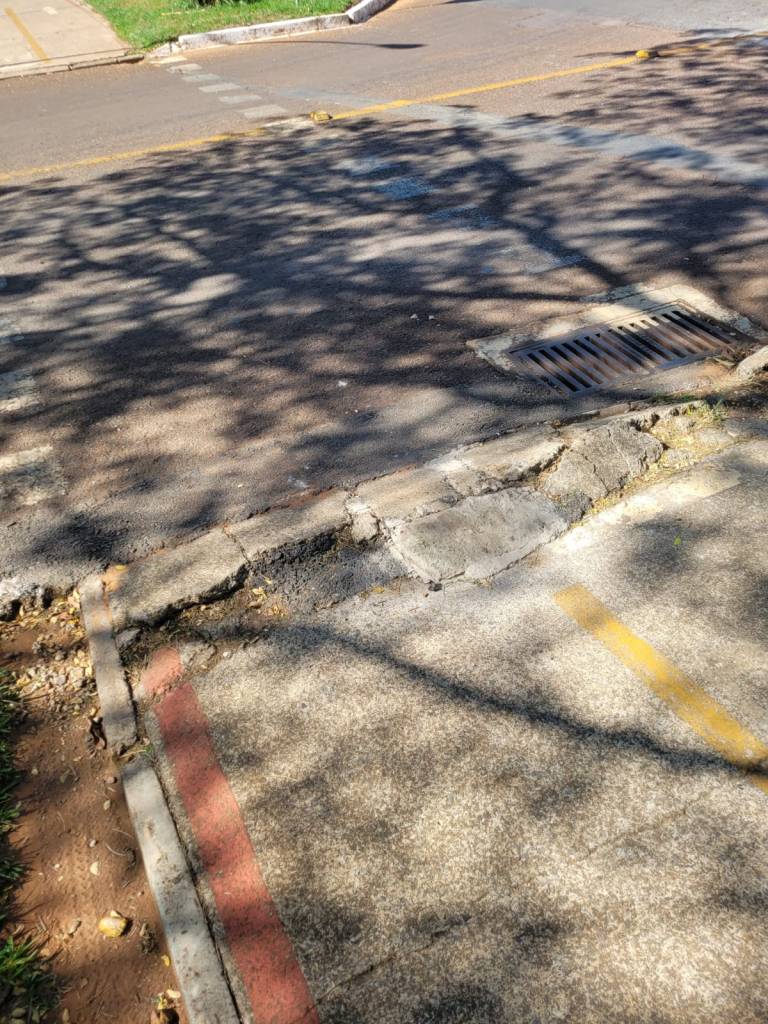 O piso está bem deteriorado, especialmente próximo da faixa de travessia, o que compromete a acessibilidade e pode causar quedas.
