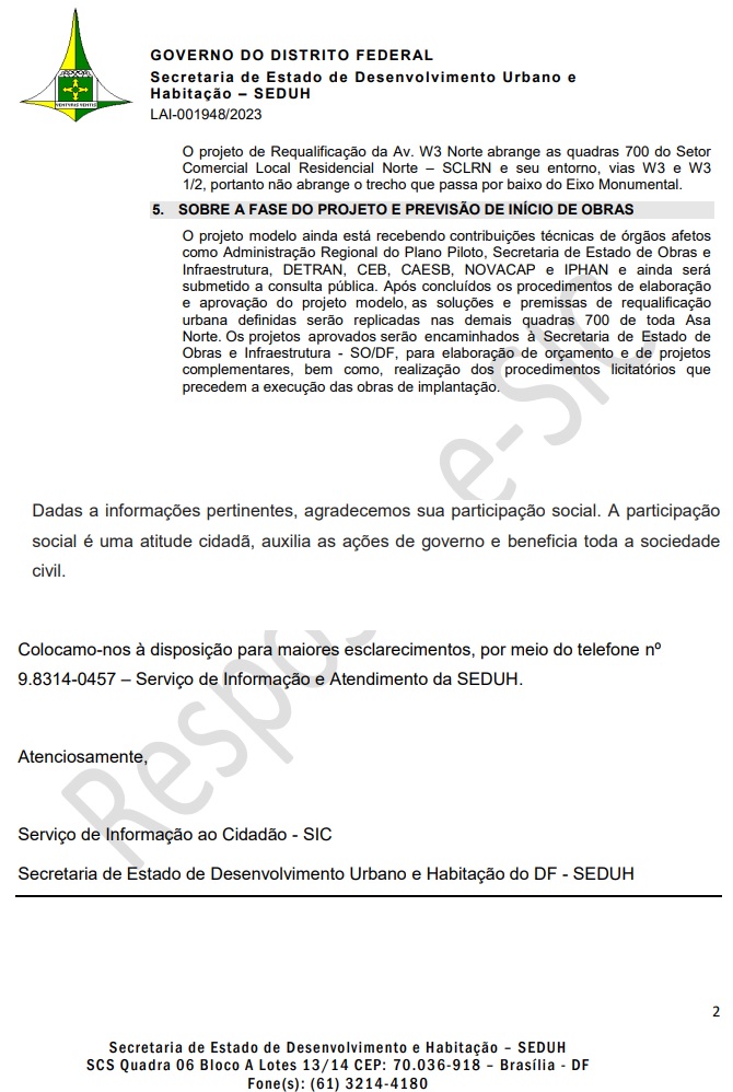 5) Em que fase está o projeto? Qual é o cronograma previsto para a execução das obras de revitalização da W3 Norte?