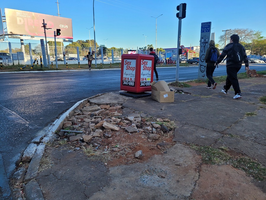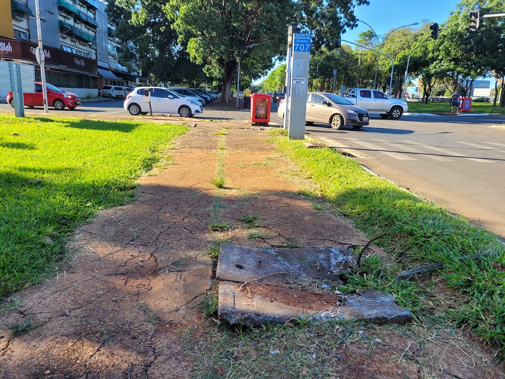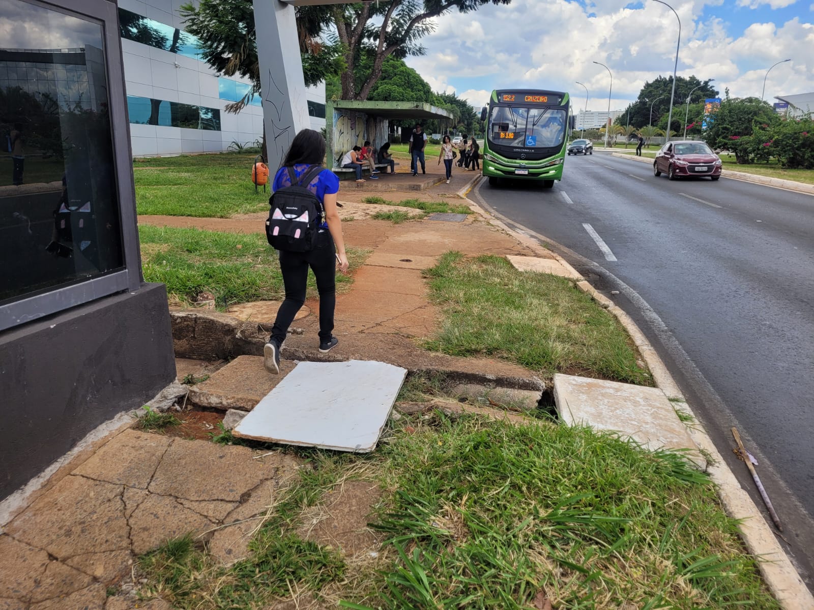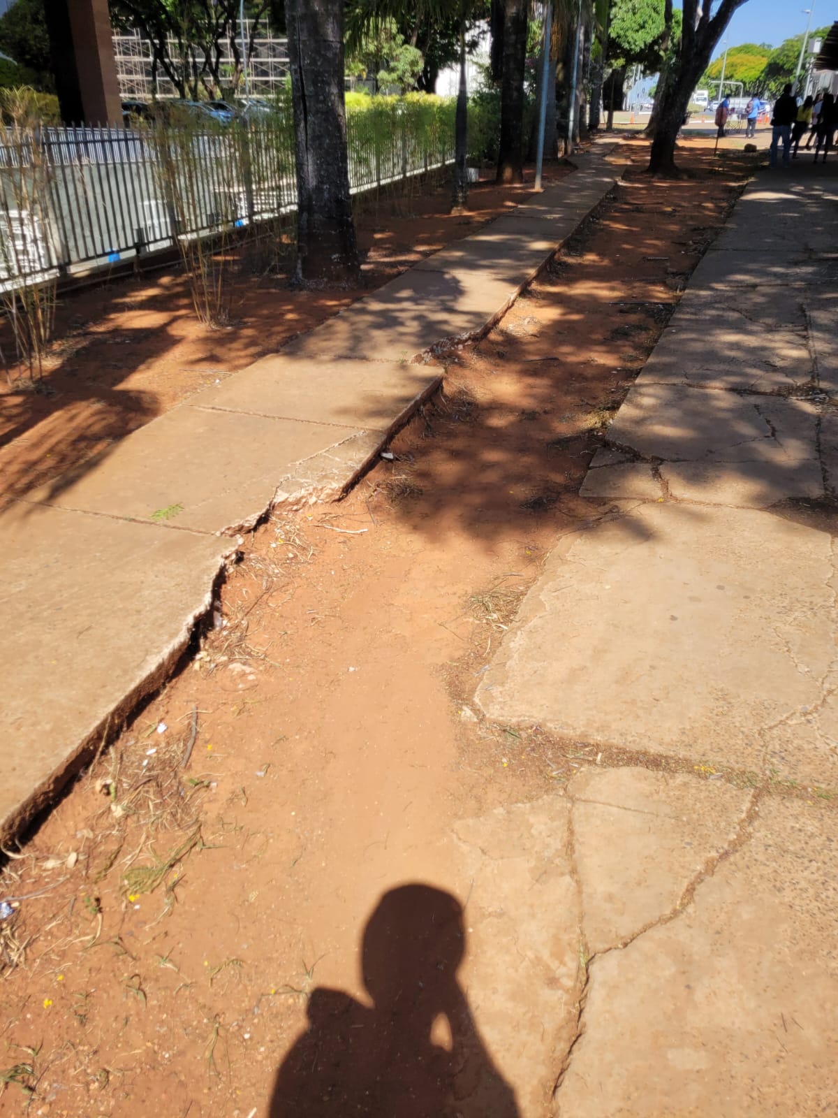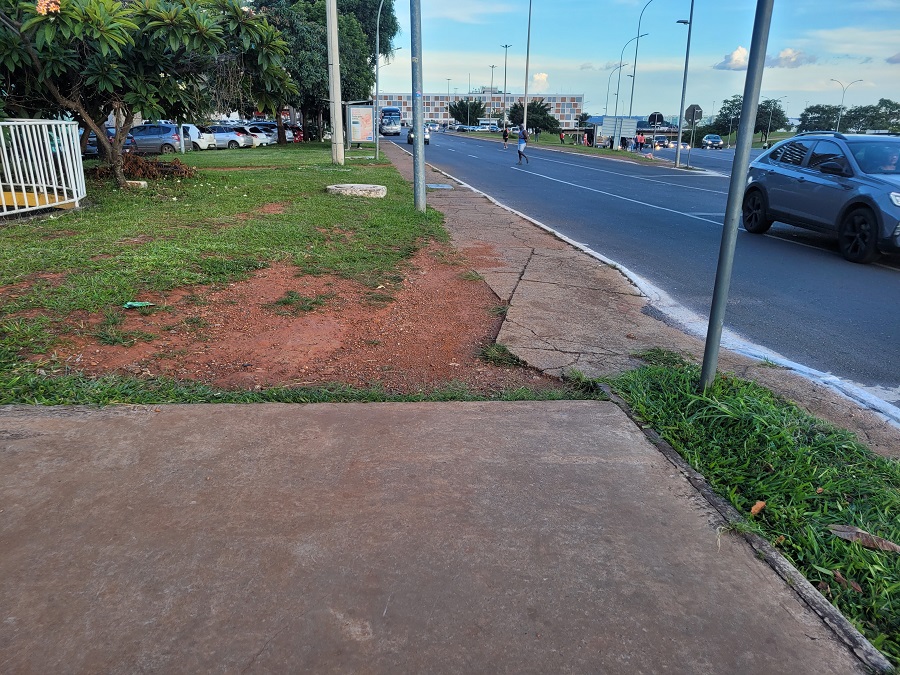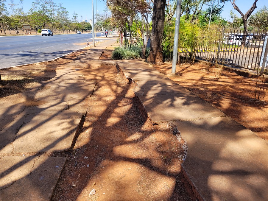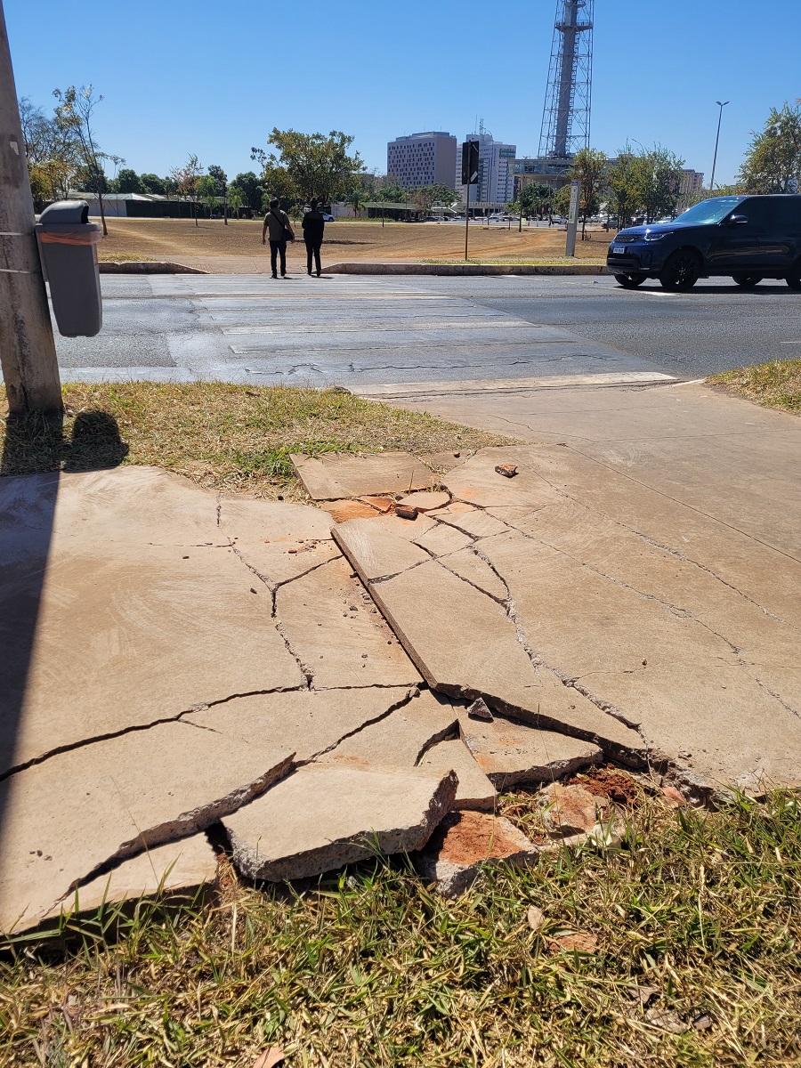 No Eixo Monumental, próximo ao Ministério Público (MPDFT), a calçada está bem deteriorada. Uma pessoa com deficiência que desembarque do ônibus fica impossibilitada de andar no local e acessar o Ministério Público em razão das crateras no caminho.