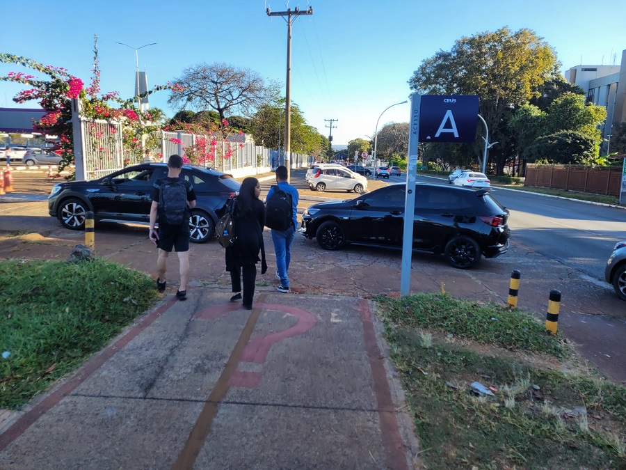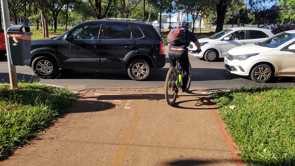 Quem passa de bicicleta precisa passar entre os carros em volta do CEUB, pois a ciclovia acaba de repente. Há inclusive interrogações – pintadas há alguns anos nos fragmentos de ciclovia – que questionam a falta de continuidade no caminho dos ciclistas.