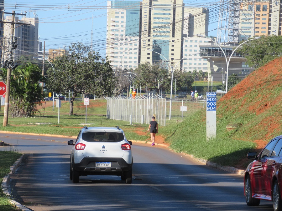 Ao passar pelo Setor Hoteleiro Norte percebo que as condições para os pedestres precisam melhorar. Um dos problemas é a insegurança na travessia. A falta de locais com faixa de travessia e o excesso de velocidade dos motoristas deixam pedestres e ciclistas em grande risco.