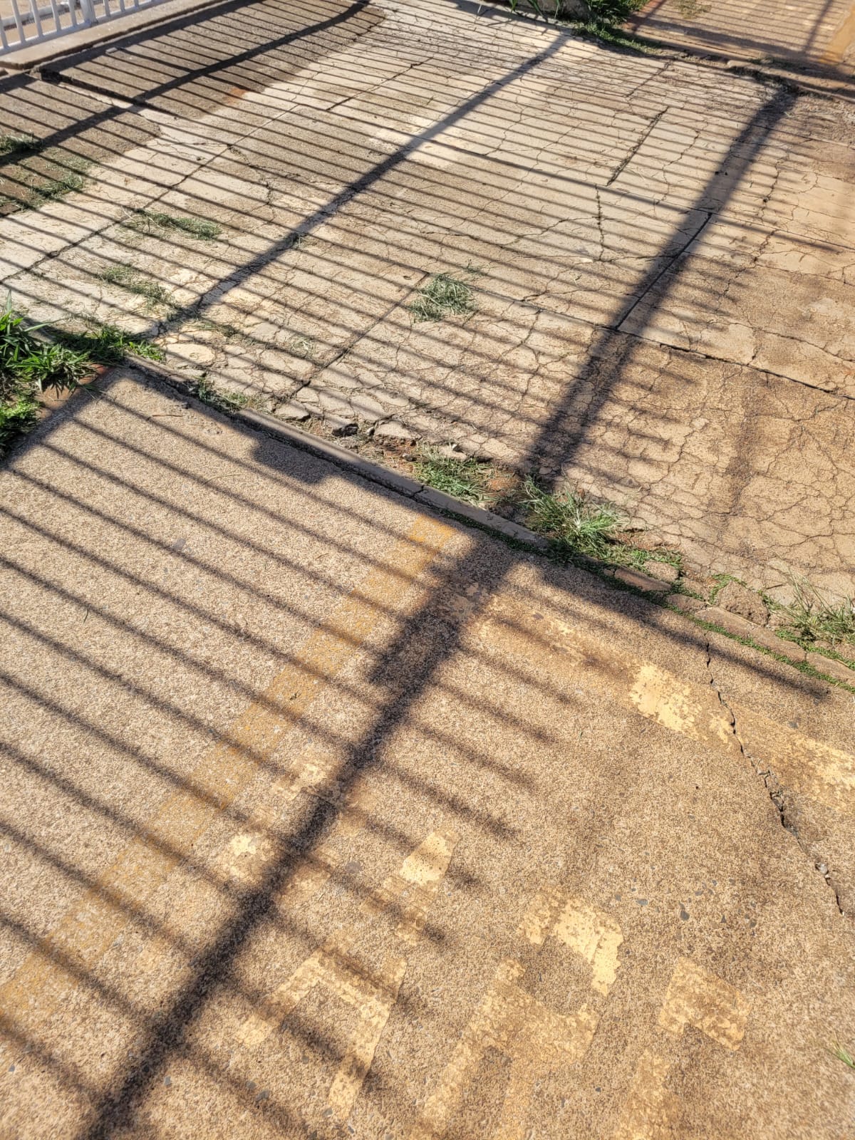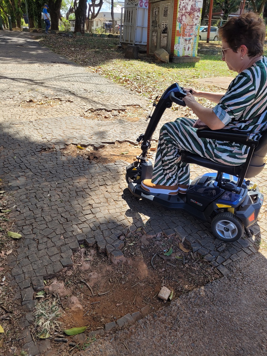 O piso está bem deteriorado, especialmente próximo da faixa de travessia, o que compromete a acessibilidade e pode causar quedas.