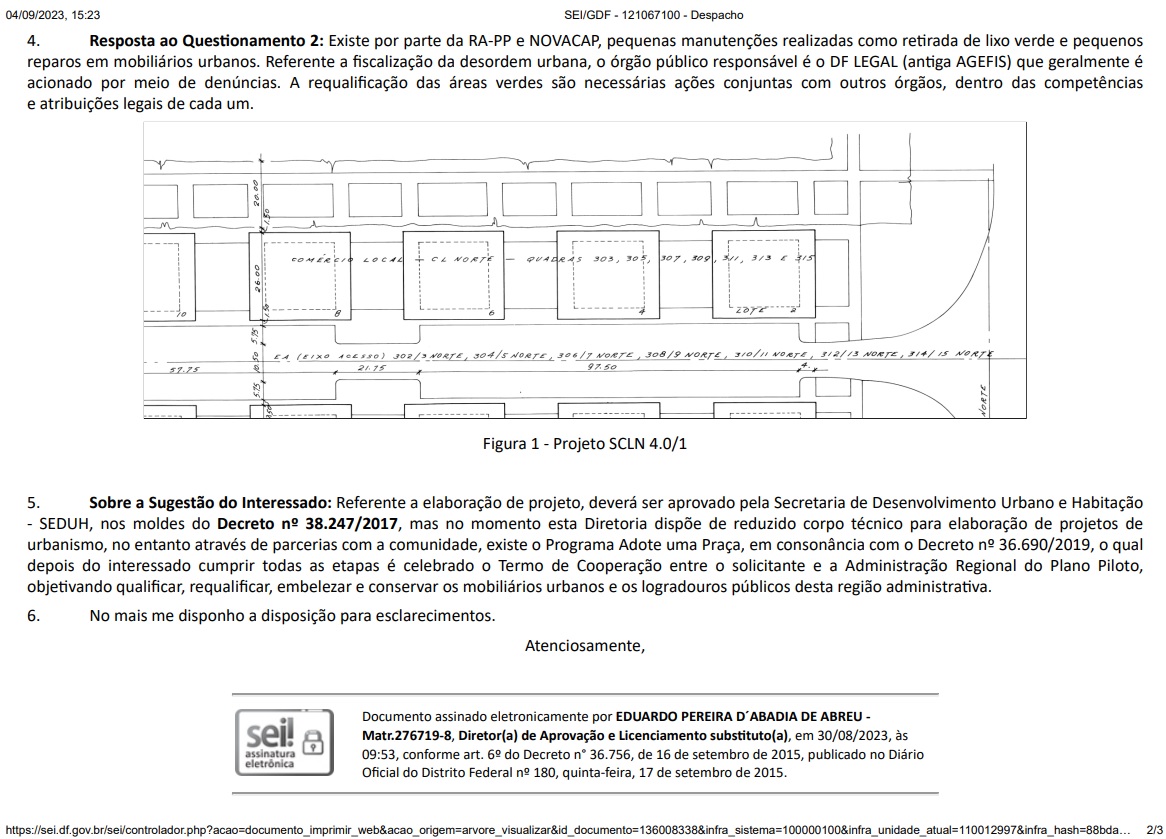 Mais uma vez, relembramos que já existem vários projetos urbanos e de requalificação aprovados para a Esplanada dos Ministérios, em conformidade com a preservação e tombamento da Esplanada. Esses projetos podem ser visualizados na Plataforma Geoportal (www.geoportal.seduh.df.gov.br), na camada INTERVENÇÕES URBANAS.