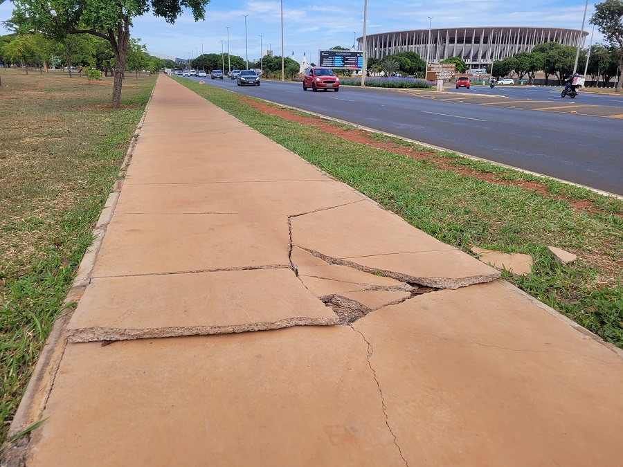 Gostaria de solicitar reparo na calçada da via que liga o Eixo Monumental ao Setor Hoteleiro Norte, próximo ao estádio. O piso está deteriorado, o que pode causar queda e ferimento.